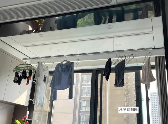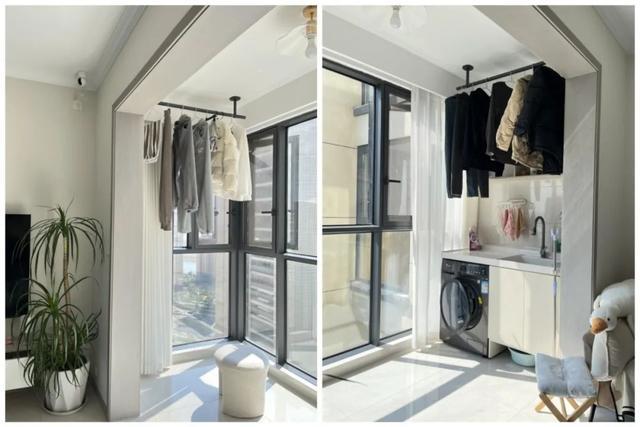 所以,为了避免这个问题,当初就给阳台安装了隐形晾衣架,想着衣服晒好后,阳台还可以作为一个休闲区来使用。