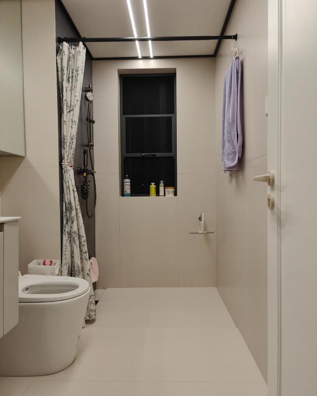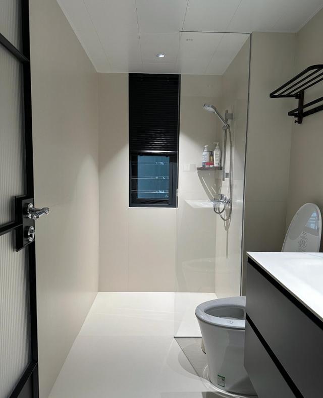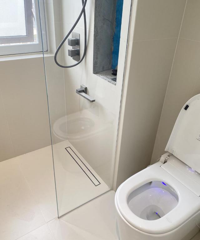 卫生间面积小,一旦安装上淋浴隔断就会显得特别拥挤。为了避免这个问题,就给淋浴区安装上了半块玻璃隔断。